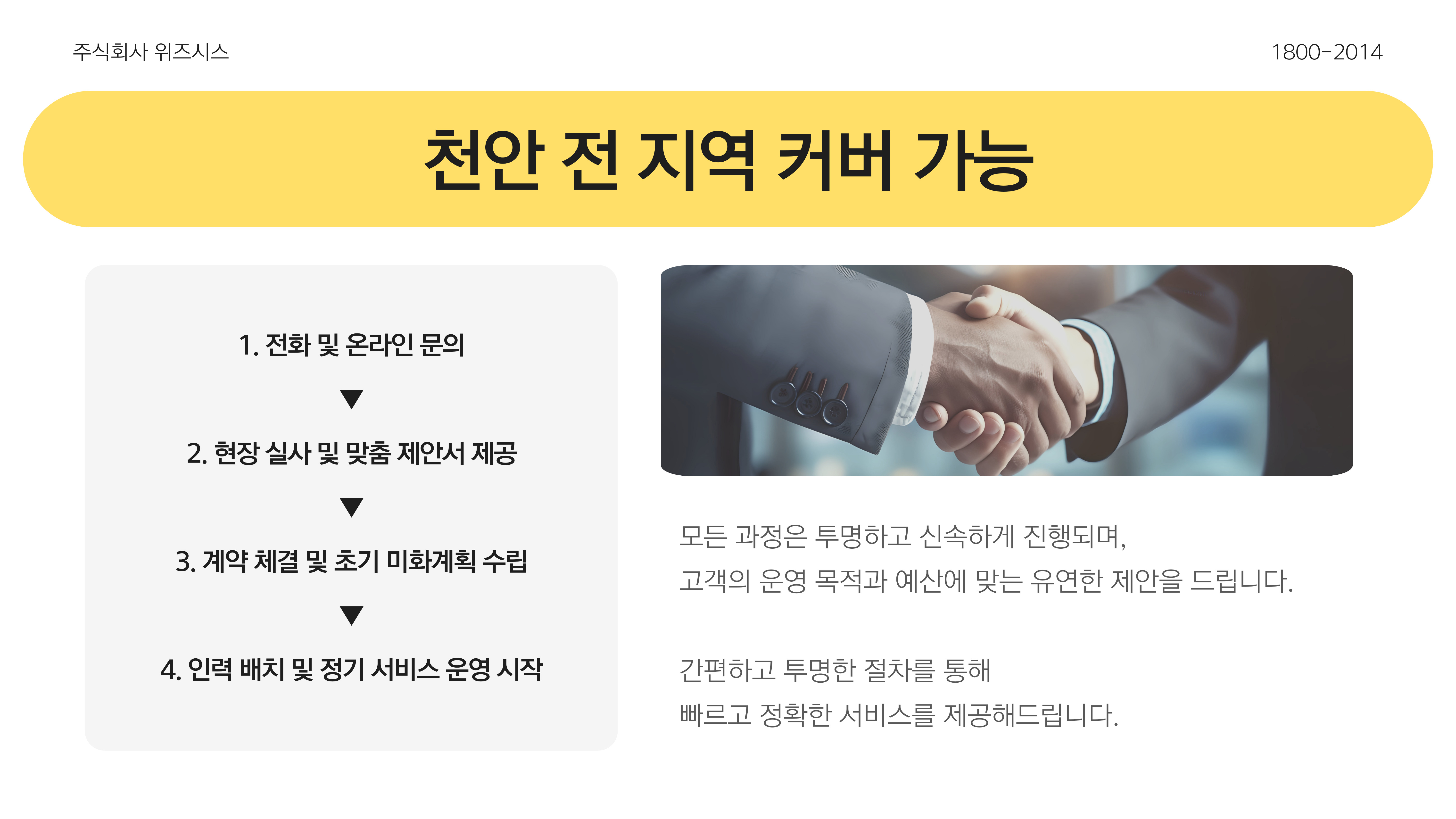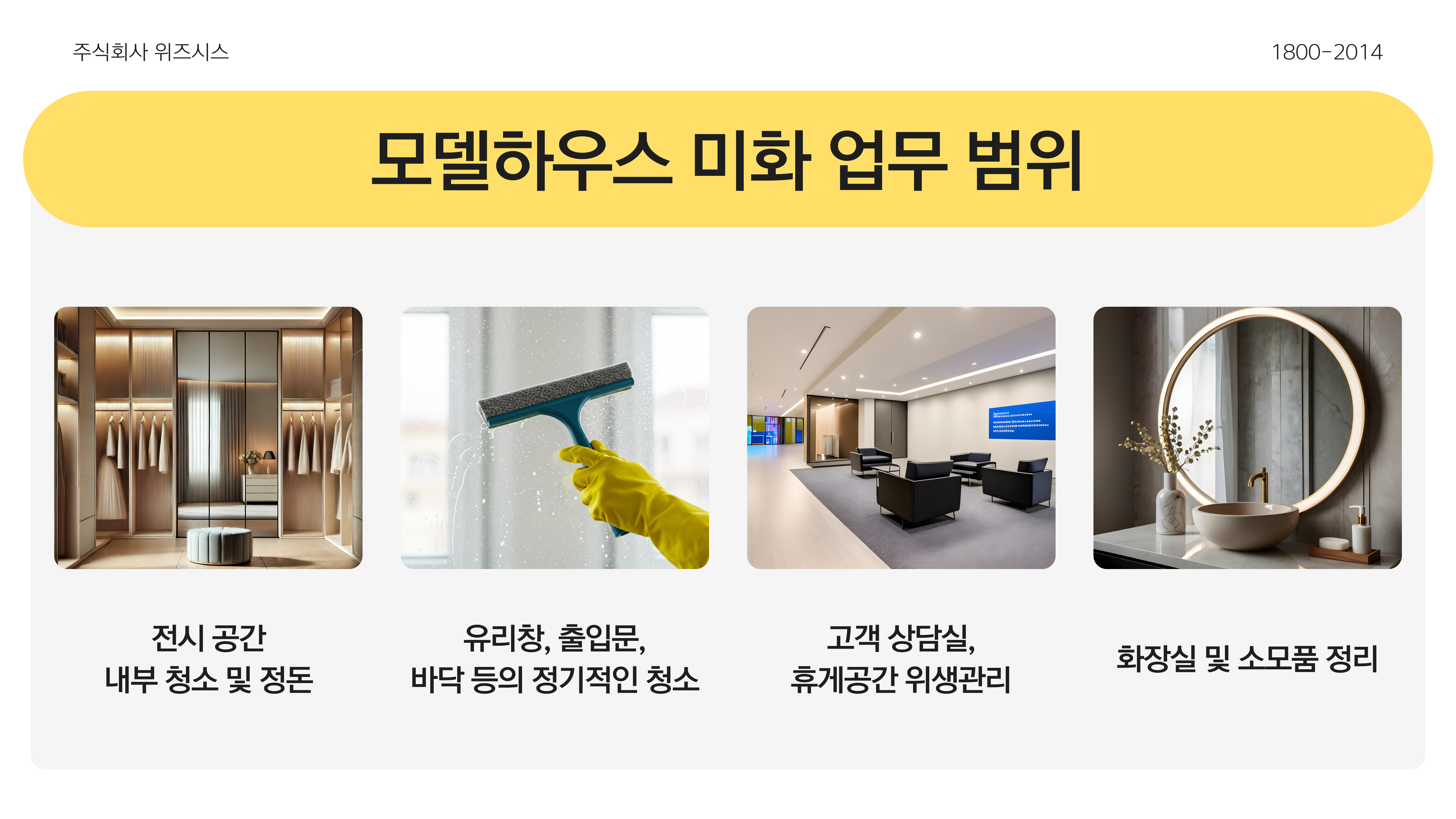 주요 서비스 분야모델하우스 및 분양 홍보관 전문 미화청소·미화·경비 등 시설 종합관리기업 및 관공서 대상 미화 인력 파견고객 맞춤형 현장 운영 시스템 제공위즈시스의 강점10년 이상의 실무 경험과 누적 관리 현장 수철저한 인력 교육 및 품질관리 매뉴얼지역 기반의 빠른 응답력과 안정적 운영계약 전 무료 견적 및 컨설팅 제공