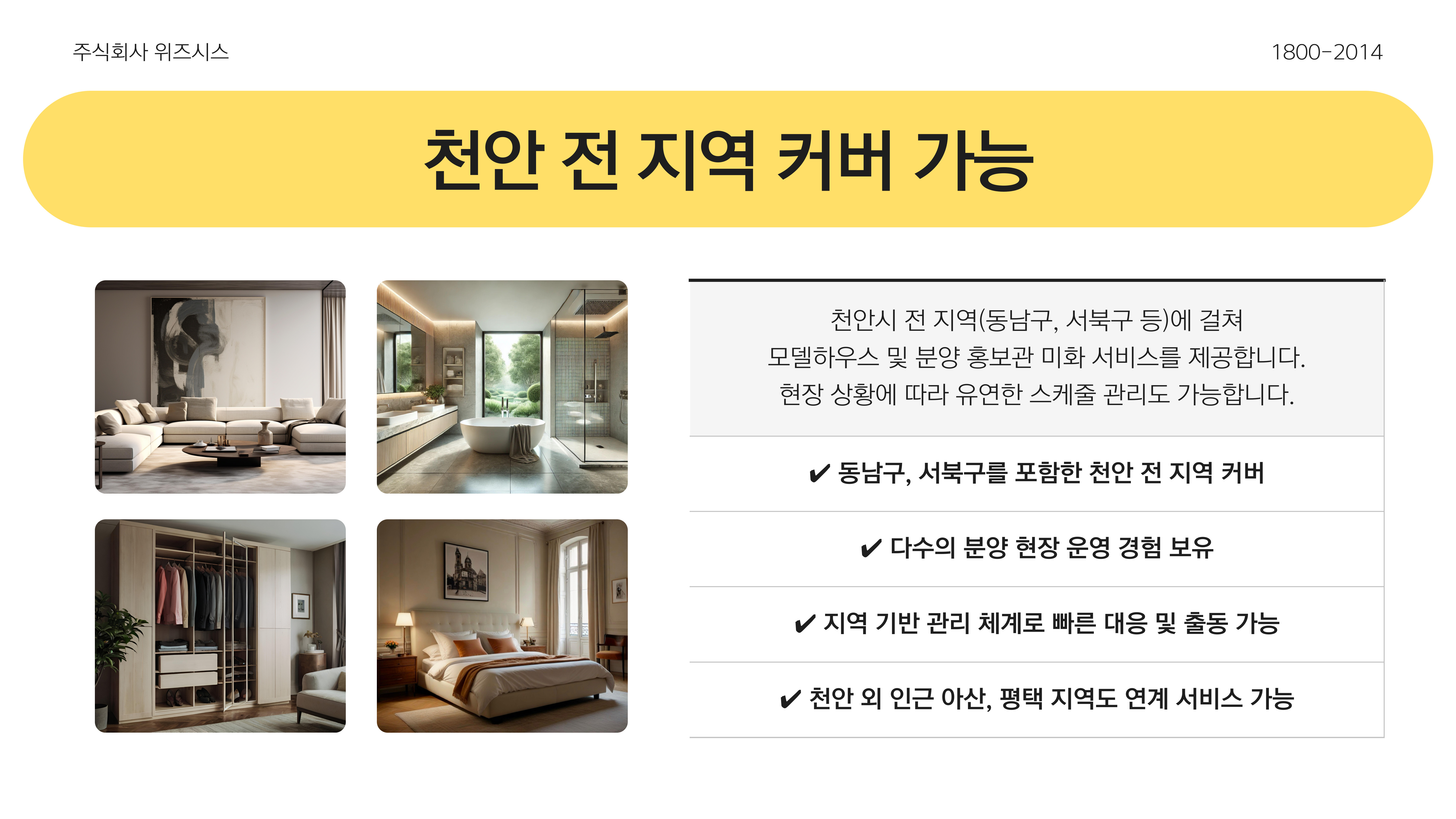 ✔️ 동남구, 서북구를 포함한 천안 전 지역 커버✔️ 다수의 분양 현장 운영 경험 보유✔️ 지역 기반 관리 체계로 빠른 대응 및 출동 가능✔️ 천안 외 인근 아산, 평택 지역도 연계 서비스 가능