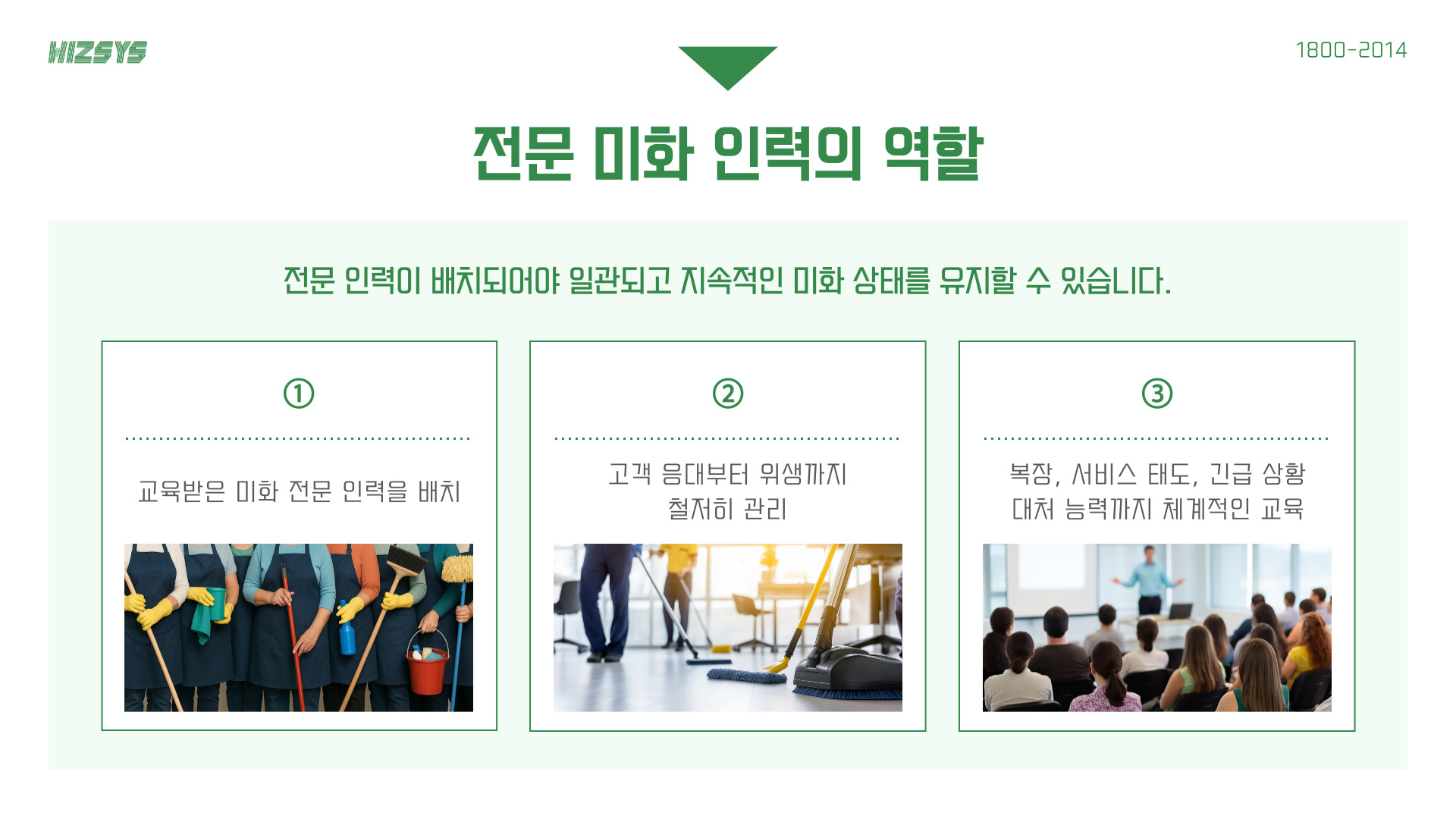 전문 인력이 배치되어야 일관되고 지속적인 미화 상태를 유지할 수 있습니다.