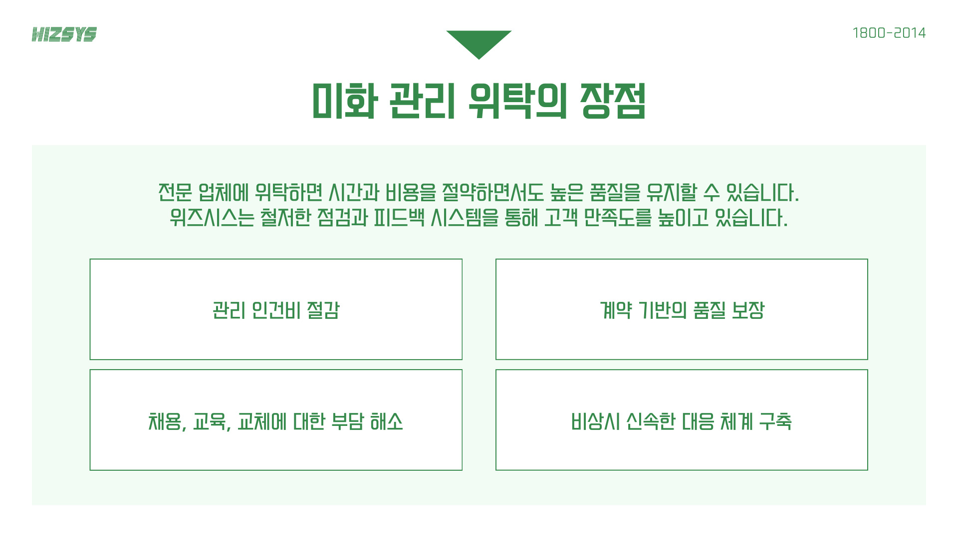 관리 인건비 절감계약 기반의 품질 보장채용, 교육, 교체에 대한 부담 해소비상시 신속한 대응 체계 구축위즈시스는 철저한 점검과 피드백 시스템을 통해 고객 만족도를 높이고 있습니다.