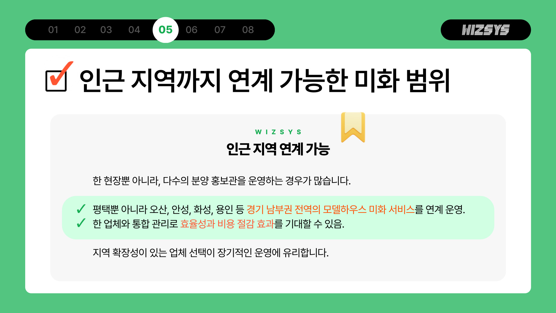 ▶ 한 업체와 통합 관리로 효율성과 비용 절감 효과를 기대할 수 있음지역 확장성이 있는 업체 선택이 장기적인 운영에 유리합니다.